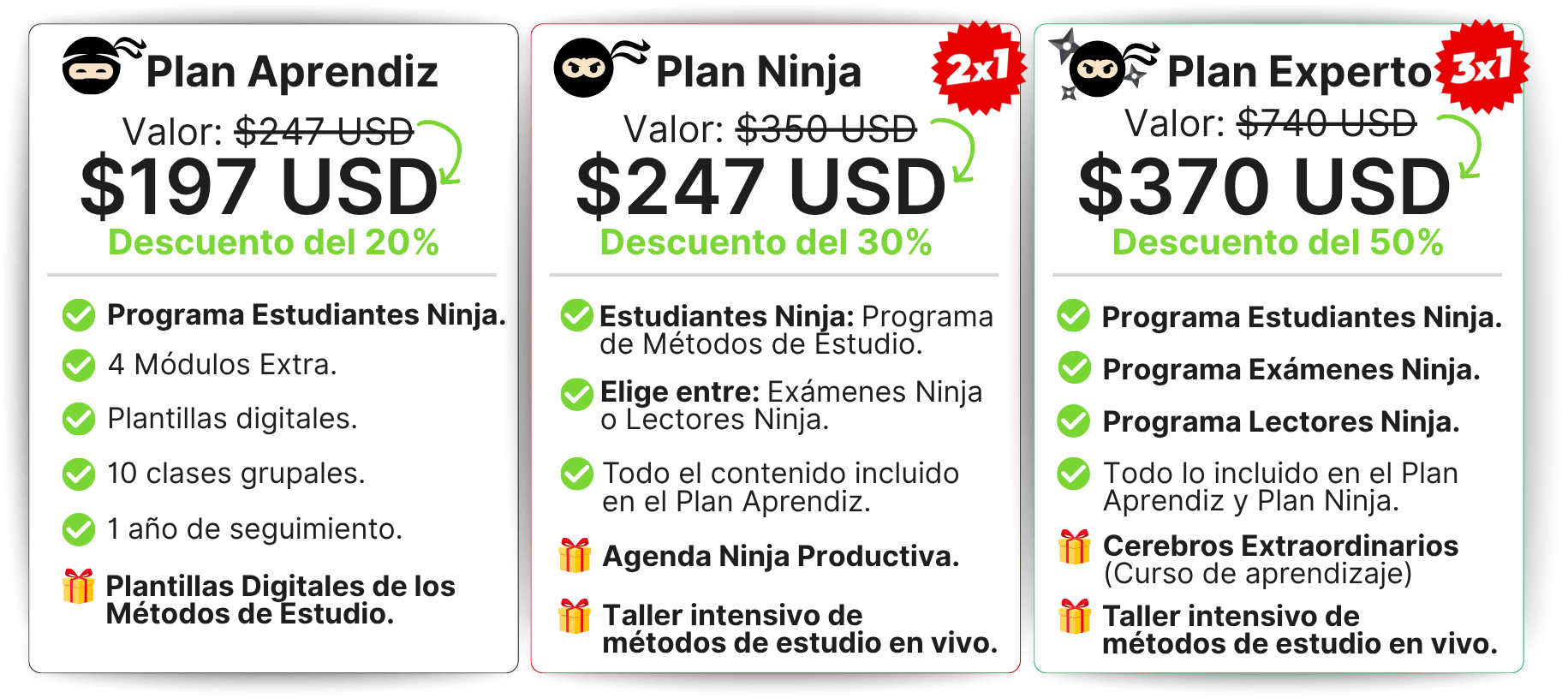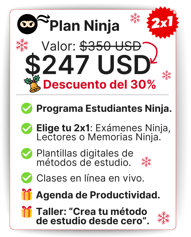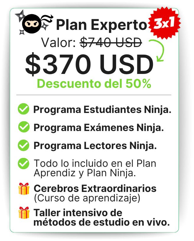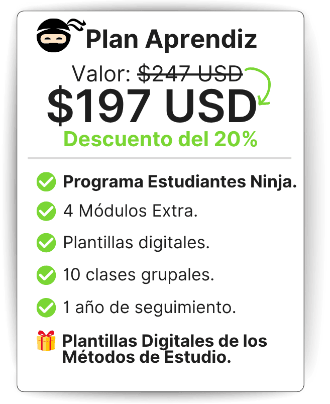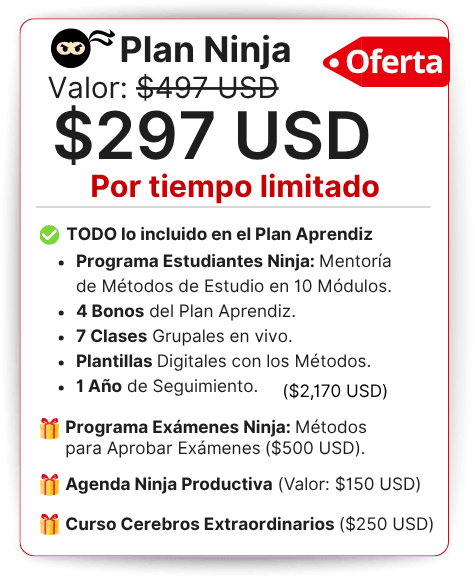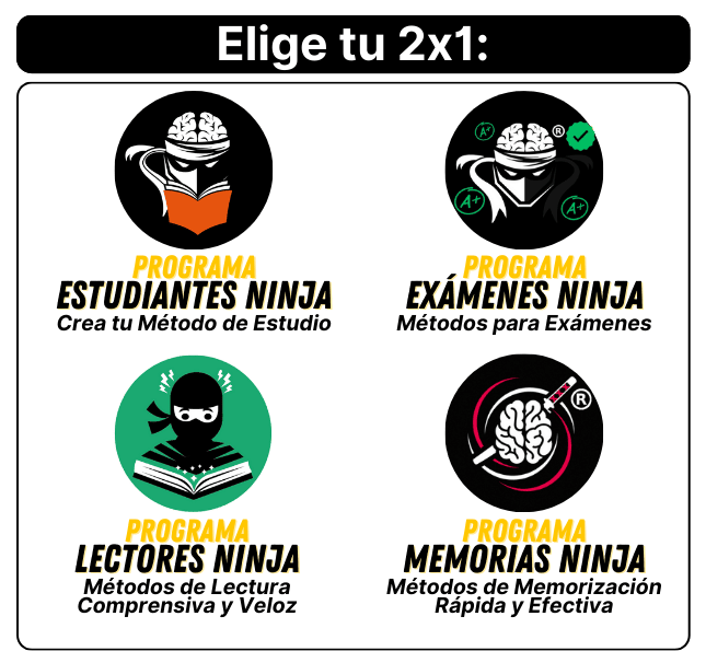 Por eso, en Estudiantes Ninja recibirás explicación de cada método de estudio paso a paso desde lo más básico a lo avanzado para adaptarlos a tus necesidades.